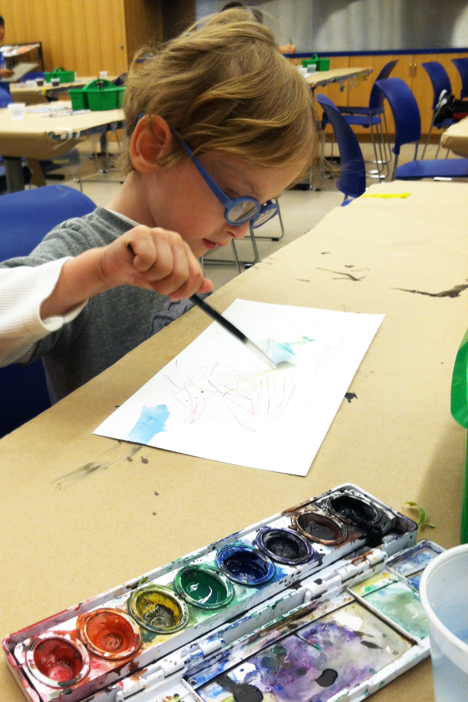 He started with a little painting. He had never used watercolors before, and we didn’t know how cool they looked when you draw with crayons first.
